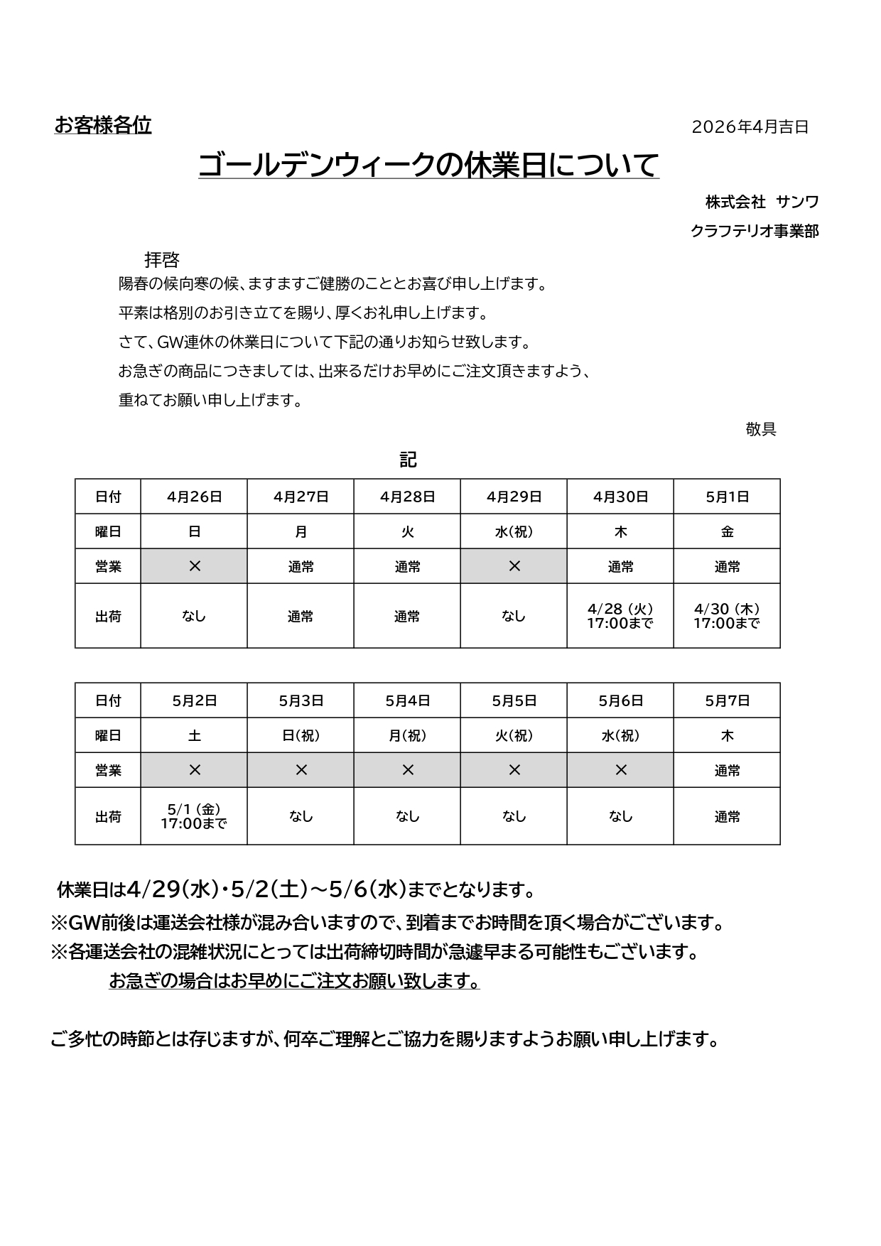 さて、GW連休の休業日について下記の通りお知らせ致します。