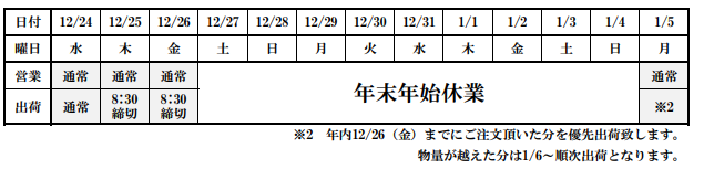 年内最終出荷は12月26日(金)午前8時30分が締め切りとなります。