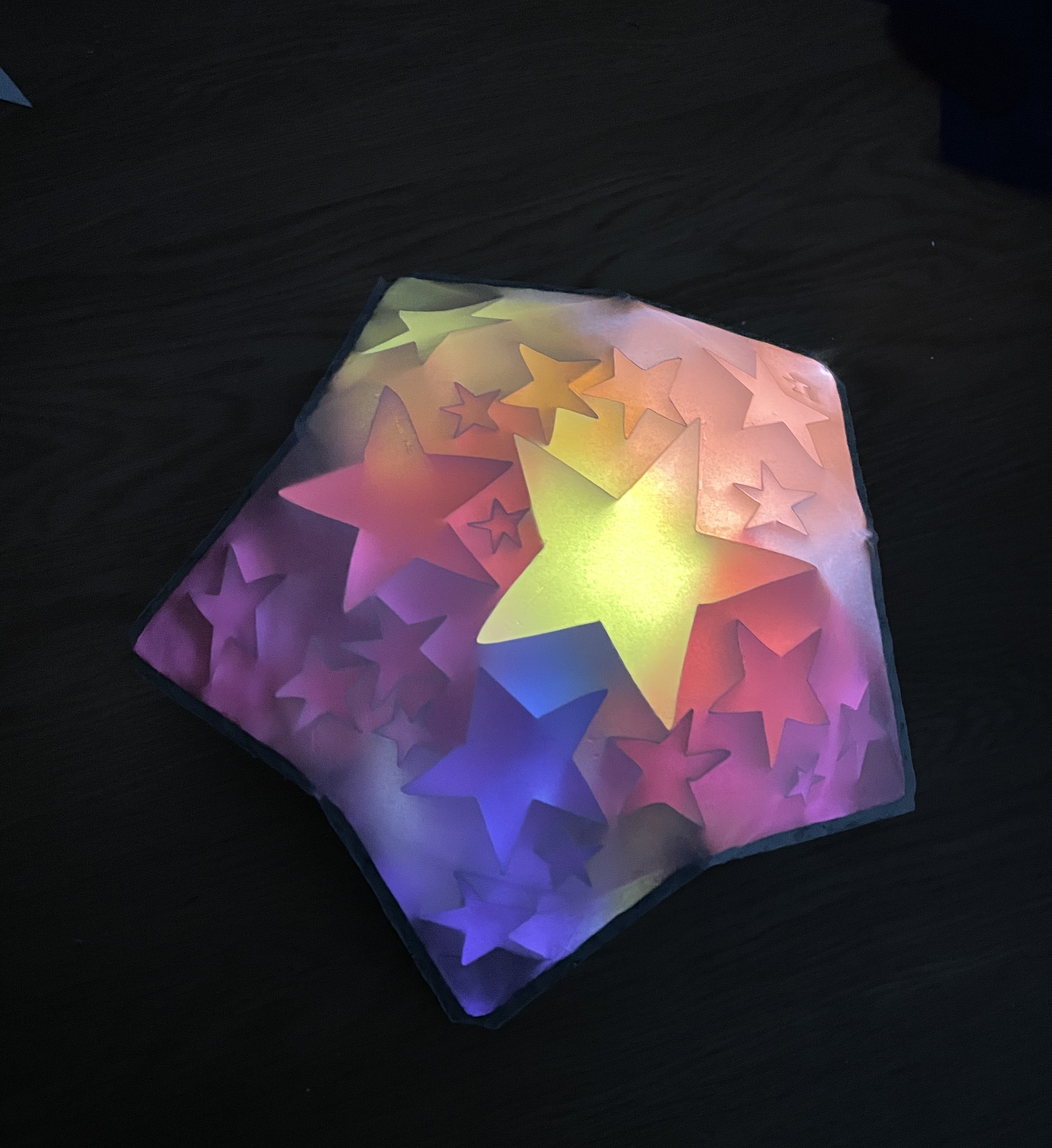 ざっくりした形で貼ったほうが光を当てた時に、雰囲気よく感じたのでセロハンはおおまかな形で切り抜きました。