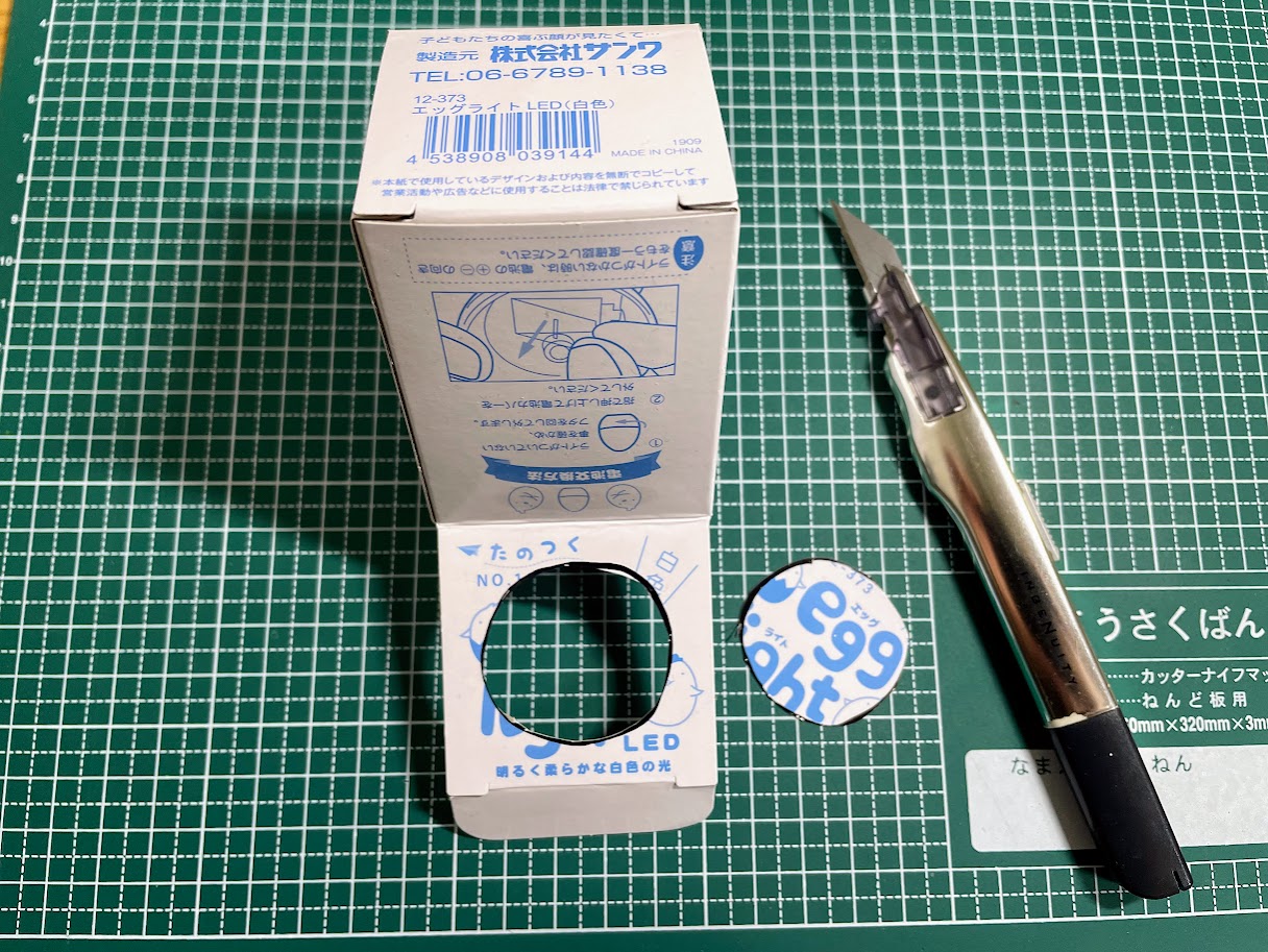 ①エッグライトの箱のフタに丸い穴をあけます。