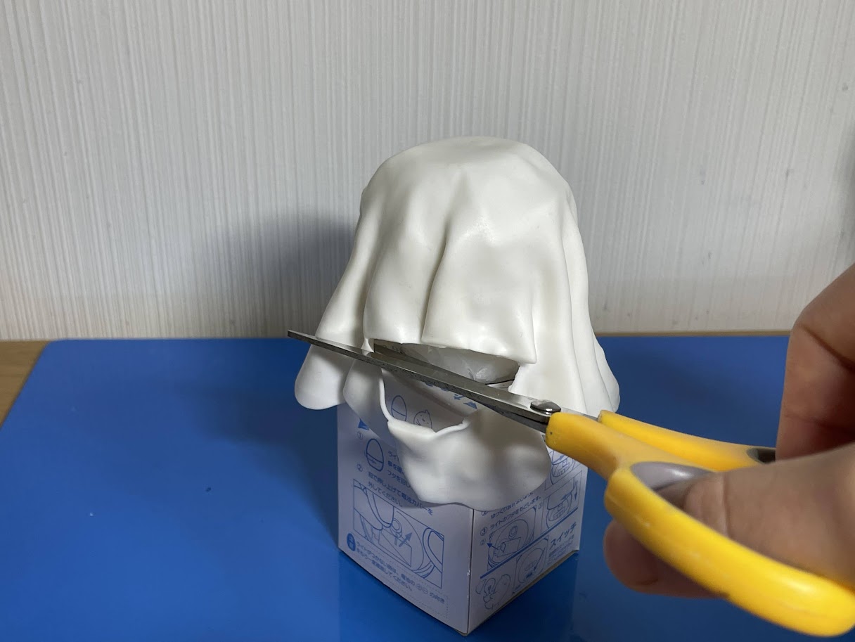 ⑥エッグライトの開口部より下の部分で余分なクリアクレイをハサミでカットします。