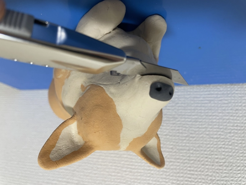 体ができたら顔周りも肉付けしたり、パーツを増やしていきます。口はカッターで切れ目をいれました。