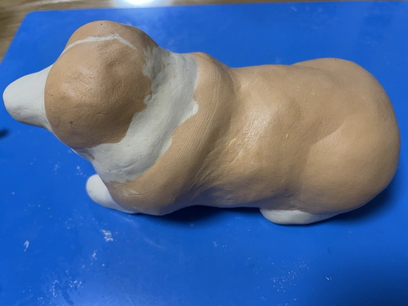 また体がのっぺりした印象だったので絵の具で毛並みで色がムラっぽくなっているところを表現しました。