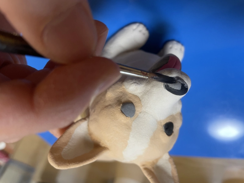 今回はアクリル絵の具で目や鼻は黒を上から塗り色をはっきりさせ、目の中のハイライトもいれました。