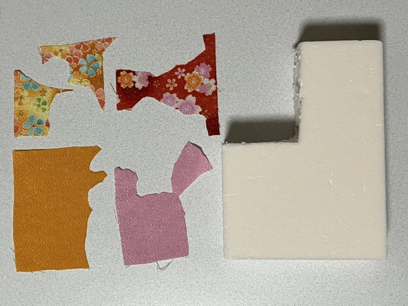 ・ちりめん布はピンク・黄・赤・黒い花柄各1枚を使いました。