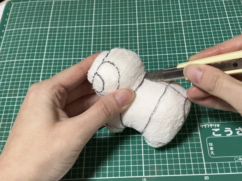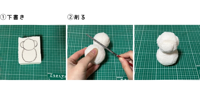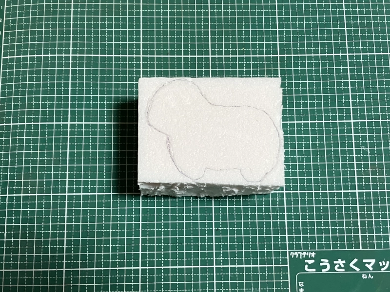 ①スタイロフォームをカッターでブロック状に切り出し、ペンで干支の形を下書きします。