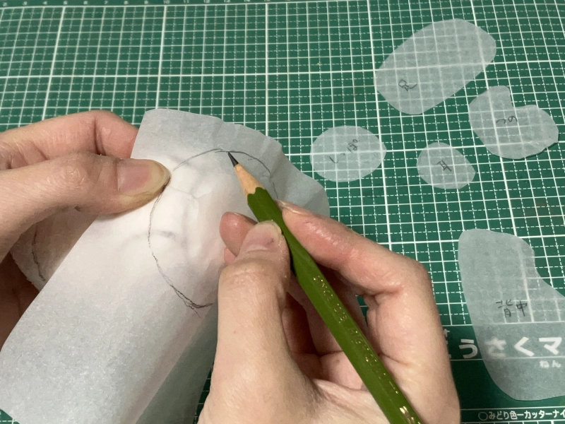 ⑤芯材にトレーシングペーパーをあててパーツごとの形を写し、切り取ります。各パーツに名前を書いておくと安心です。