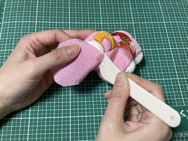⑦ヘラで溝に布を押し込んでいきます。細かい部分は竹串やつまようじを使うときれいに仕上がります。