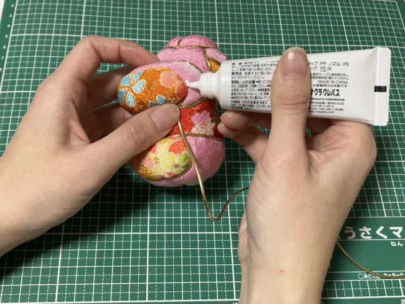 ⑧溝に接着剤をぬり、上から紐を貼り付けます。紐の端は、溝の中へ入れ込みましょう。