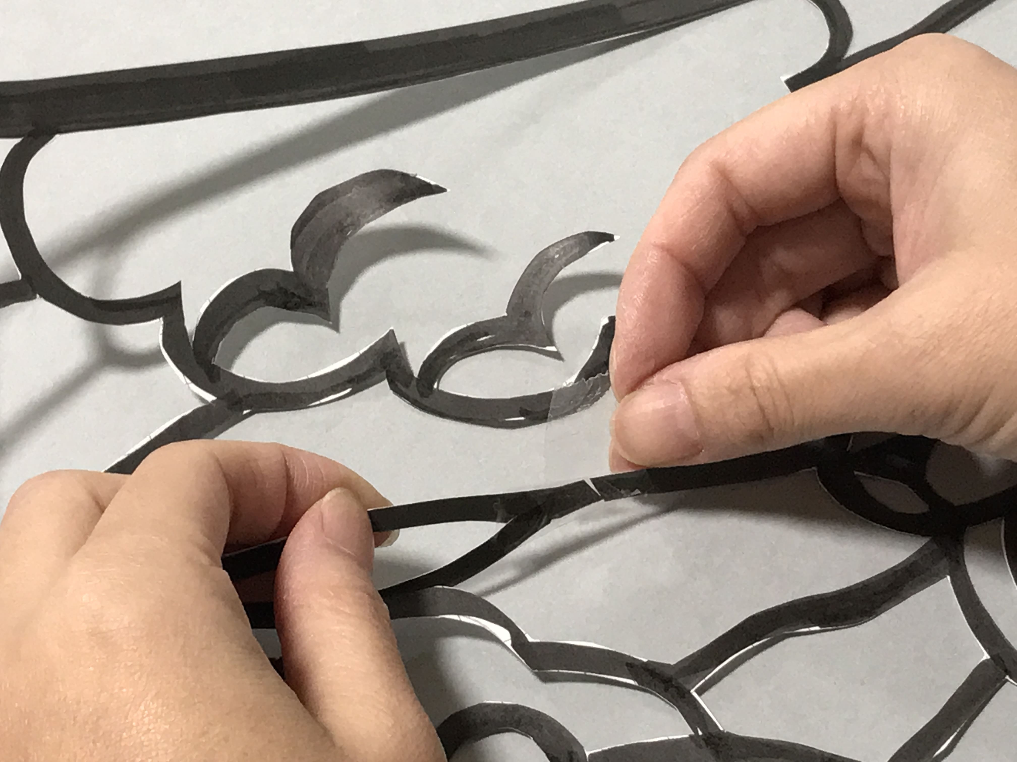 型紙を黒色つやボール紙にセロハンテープで固定します。