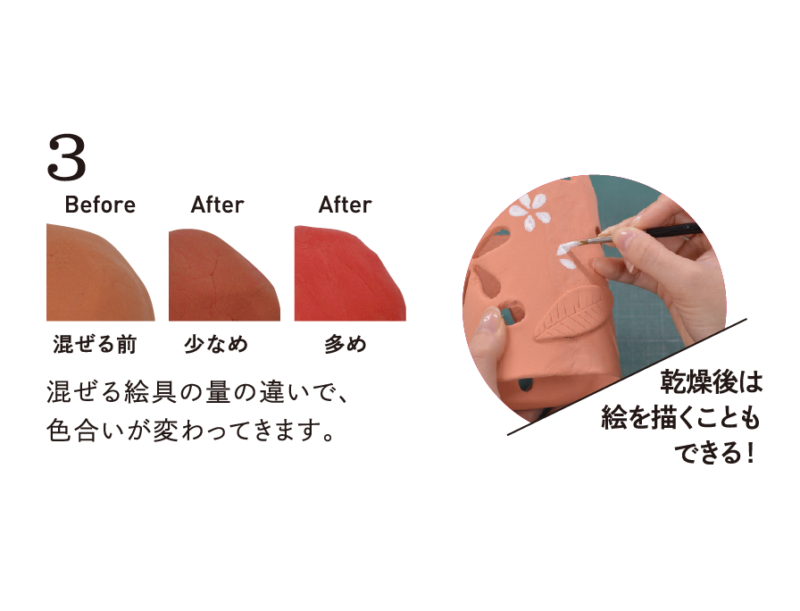 粘土に絵の具を混ぜ込んで色合いを変えてみたり、乾燥後にお好きなデザインを描いてみたりと風合い豊かな作品づくりを楽しむことが出来ます。