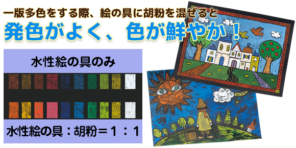版画において、一版多色を刷る際、絵の具に胡粉を混ぜると発色が良く色鮮やかに仕上がります。