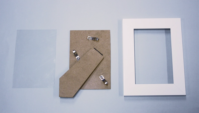 全体を覆うように平たくつけていきましょう! ※制作の前に、フレームから透明板・裏板を外しておきましょう!