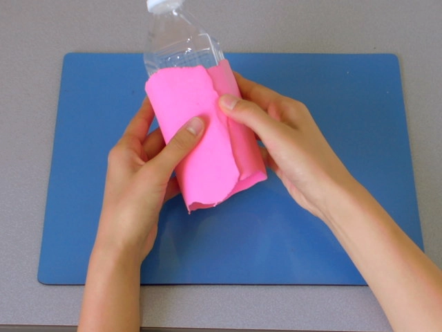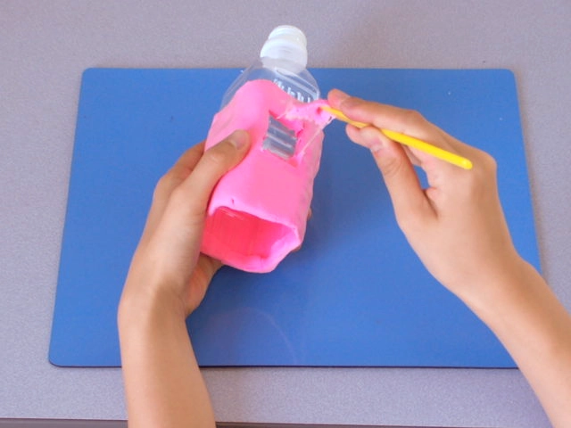 薄く平たく伸ばした粘土をカットしたペットボトルに貼り付けていきます。