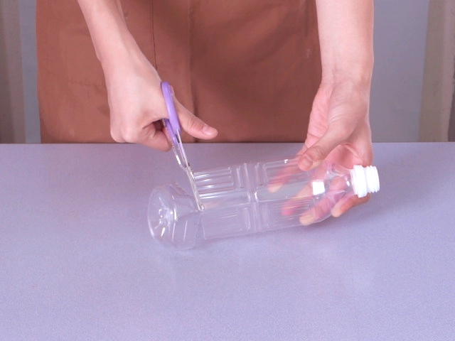 はさみでよく洗って乾かしたペットボトルの底部分を切り取ります。