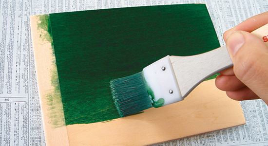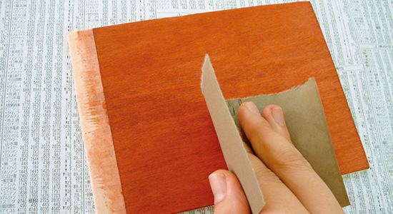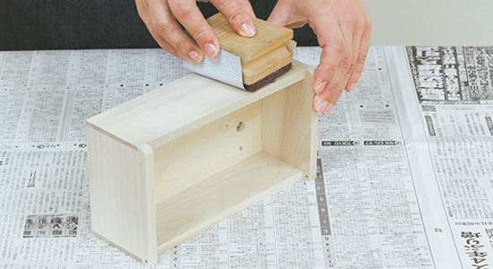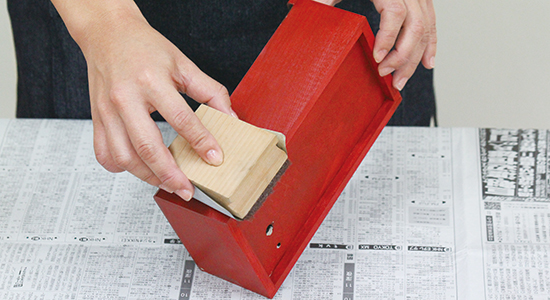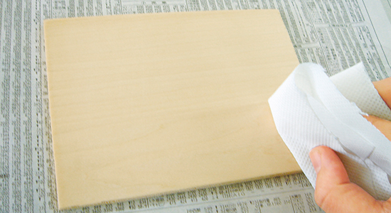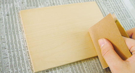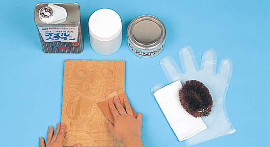 塗料を塗る面は木目にそって紙やすりをかけ、粉は柔らかい布で拭き取っておきます。 ※ニスは最後の仕上げとしてツヤを出したり、色止めの目的で使用します。 作品を絵の具等で彩色している場合は、適切なものを選ばなければ滲む場合がありますのでご注意ください。