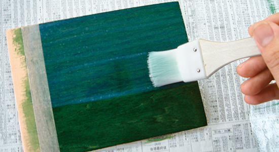 塗り重ね 水性工芸うるしを刷毛で塗ります。3回以上塗るとよりきれいになります。 ↓