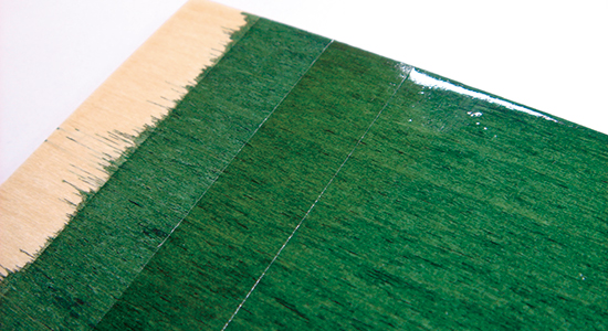 水溶性ニスを木目にそってゆっくりと気泡が入らないように刷毛で塗ります。 ↓