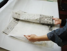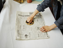 ④水で湿らした和紙を台紙にのせ、新聞紙で挟んでバレンでこすります。