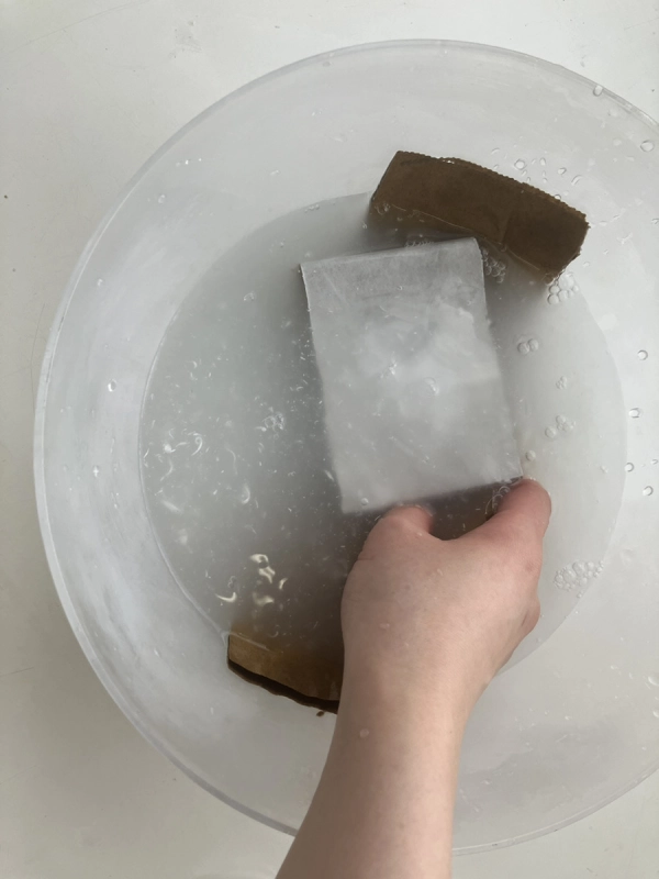 段ボールを浸して乾燥させると、液体粘土を浸した布のように、形が固定できます!
