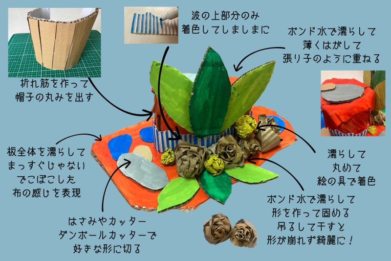 段ボールの特性を活かした技法を紹介しながら2つの作品を作っていきます!