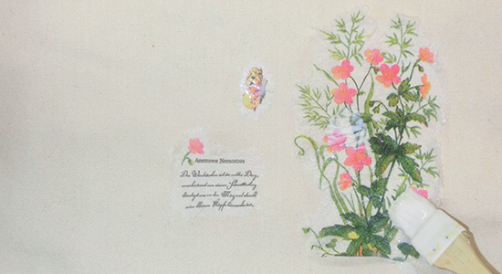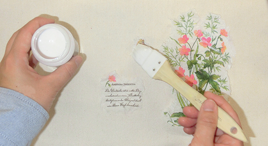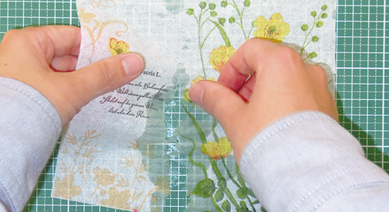 柄を貼り付けて、デコパージュ液を生地に塗布します。
