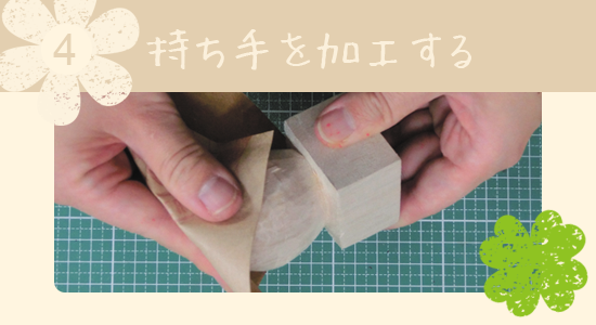 付属の両面テープや接着剤を使って、ゴムスタンプを持ち手に付けます。
