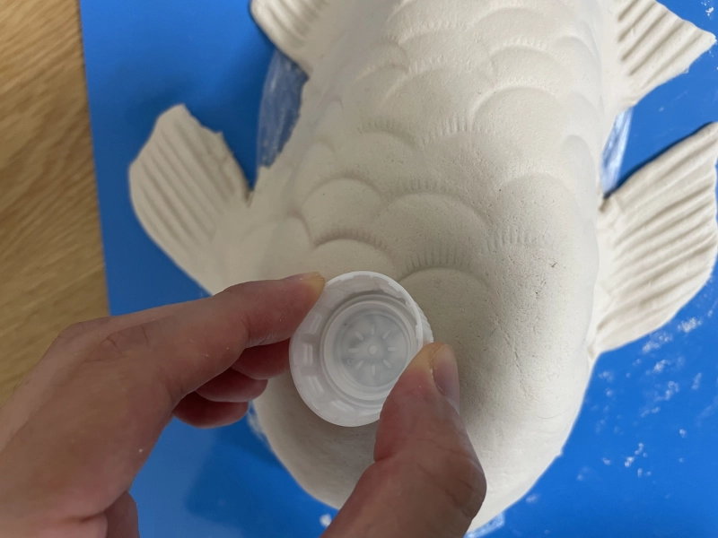 ペットボトルのキャップを押し当てて鱗を作ります。