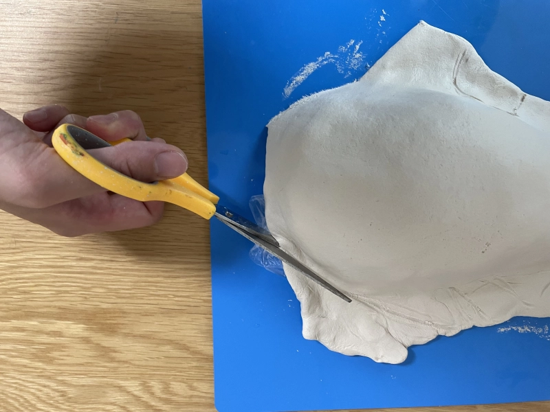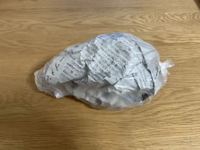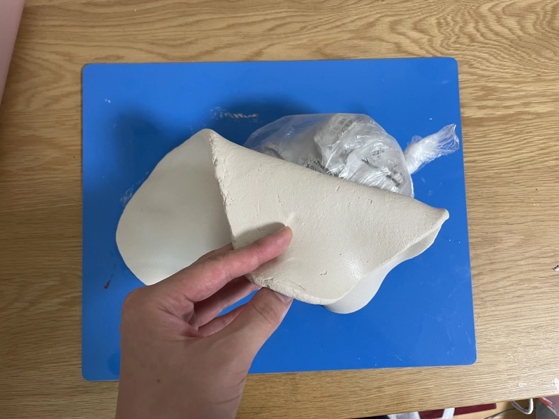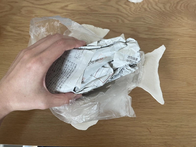 型のビニール袋を切り、まずは新聞紙を抜き、残ったビニール袋を剥がすという手順で型からFクレイを外します。