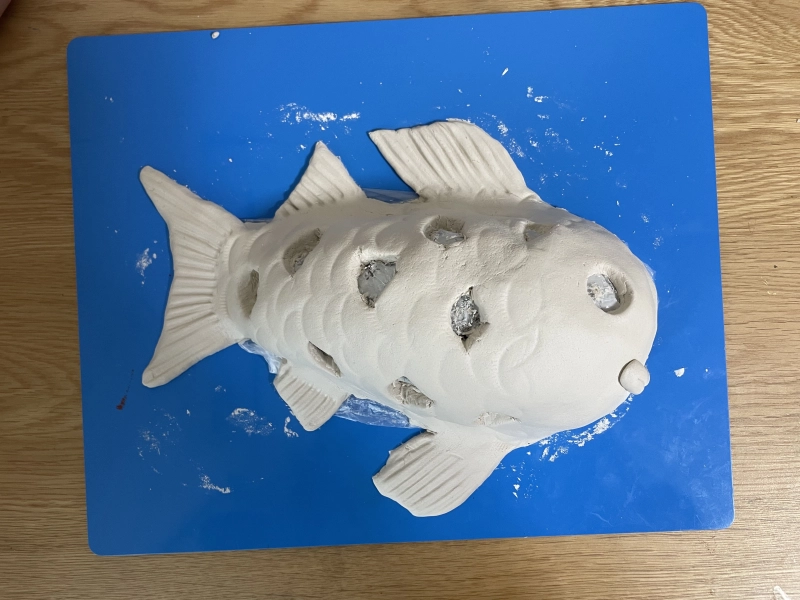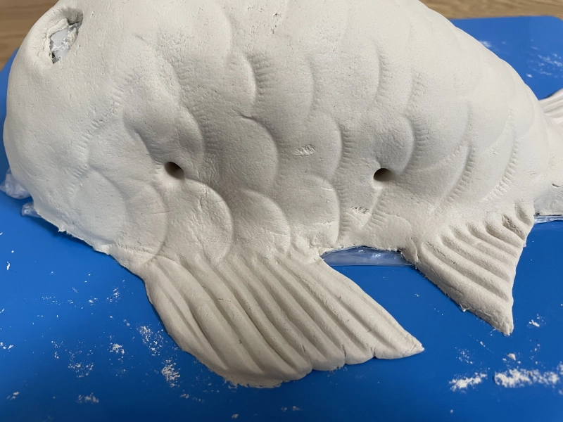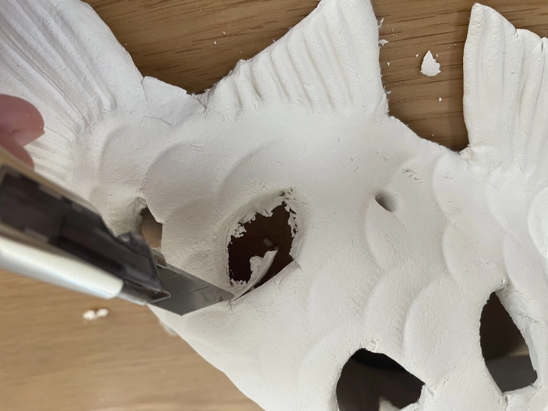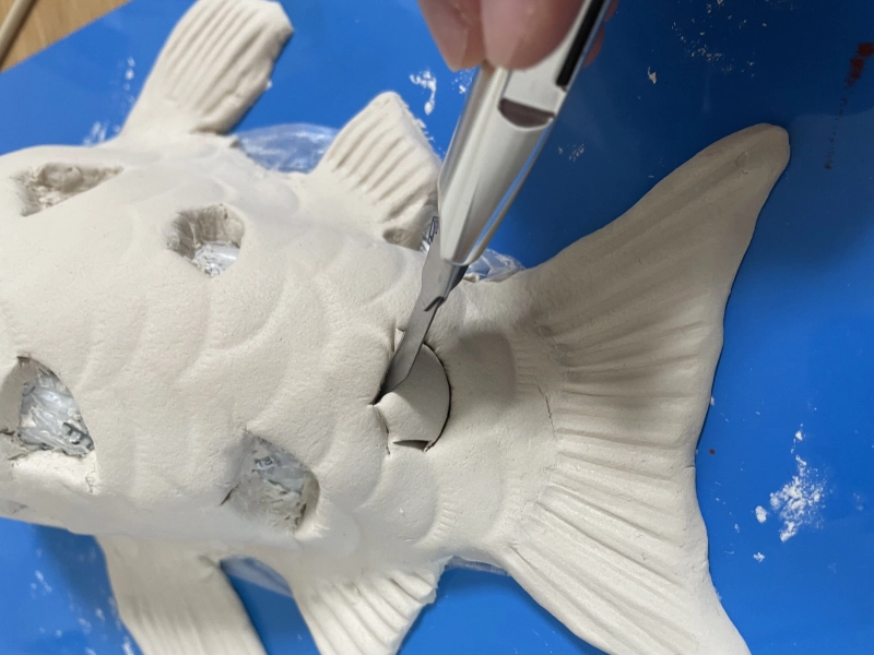 鱗や目の穴の形をカッターで削って整えます。
