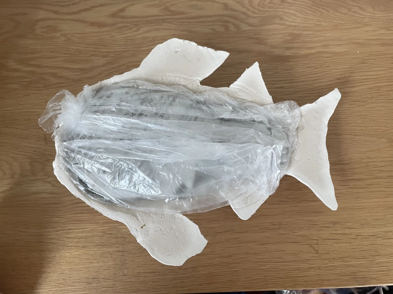 まずは魚の型を作ります。まるめた新聞紙をビニール袋にいれて作りました。