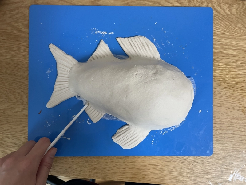 粘土に薄く魚の形の下書きの線を入れます。