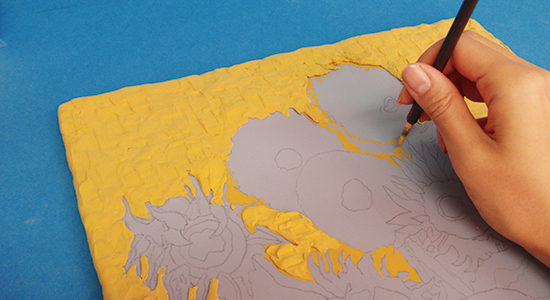 絵の境界線に細く伸ばした粘土を埋め込む。 立体表現