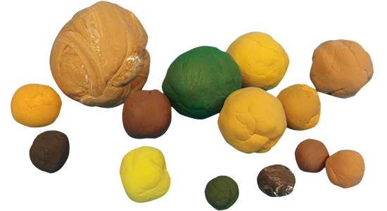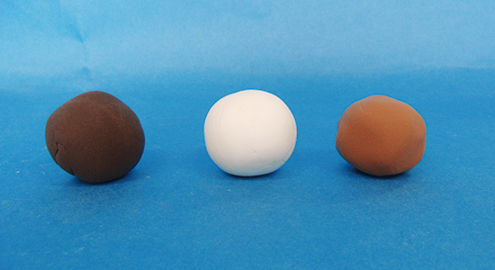 粘土の真ん中に絵の具を少し出し、包み込むように丸める。 ↓