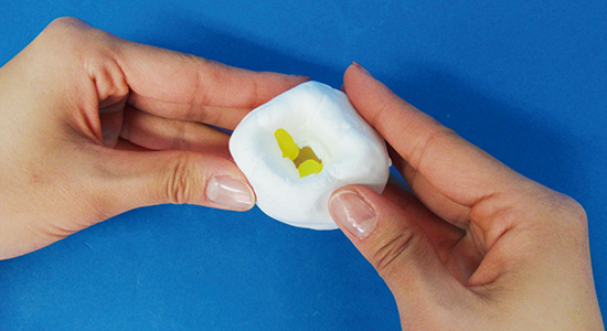 ちぎった粘土の断面を壊さないように貼り付ける。 めしべの表現(つまようじで)