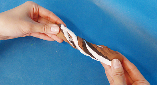 カラー粘土同士を合わせてマーブル粘土をつくると発色が良い。 ヘラで型押しする