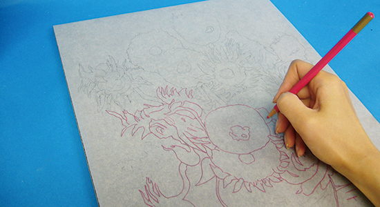 葉っぱや花びらなど細かい部分はあらかじめ板に絵の具で着色しておく。 ↓