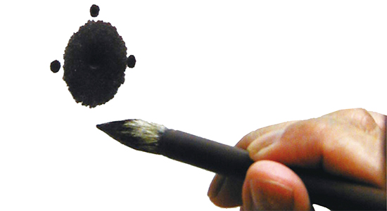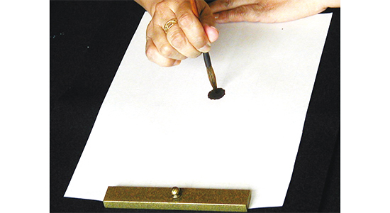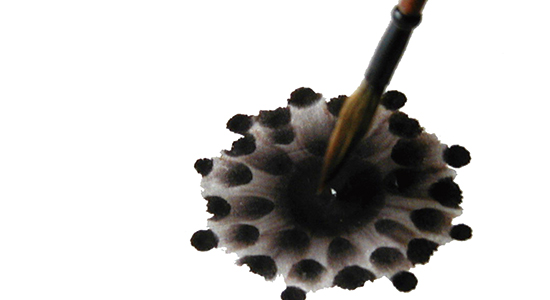 丸の中央へ水を含ませた筆の穂先をつけてにじませる。 きれいな形の傘模様をつくるために、最初の一滴はごく少ない水でにじませる。