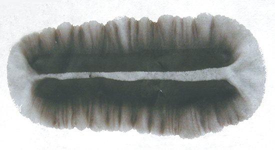 同じ場所に何度も水を落とすことを繰り返すとにじみで墨が広がり、大きな傘模様がつくれる。 墨が筋状に残って傘の骨に似ている。 たくさん並べると、花にも見える人気の模様になる。