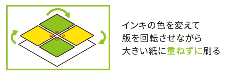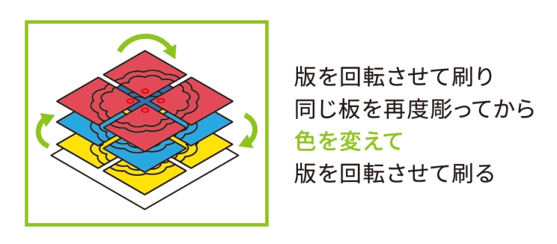 ・重ね刷りは、3色程度のインキを90度ずつ回転させて重ねることで、色と彫りの重なりによる予想外の効果を生み出すことが特徴で
