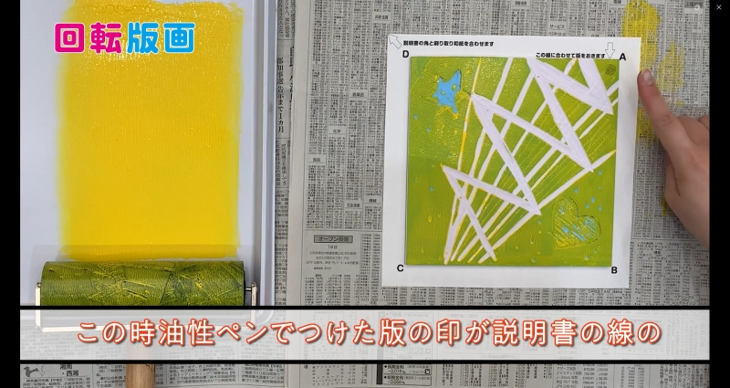 インキのついた版画板を、先程つけた印がAの場所にくるように置きます!