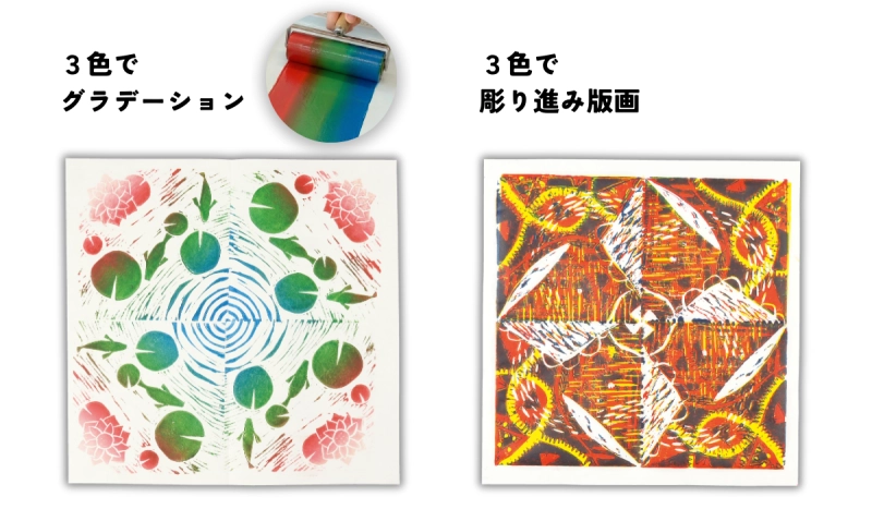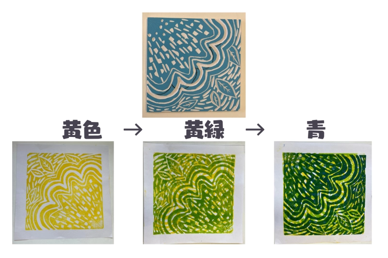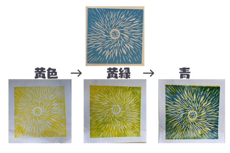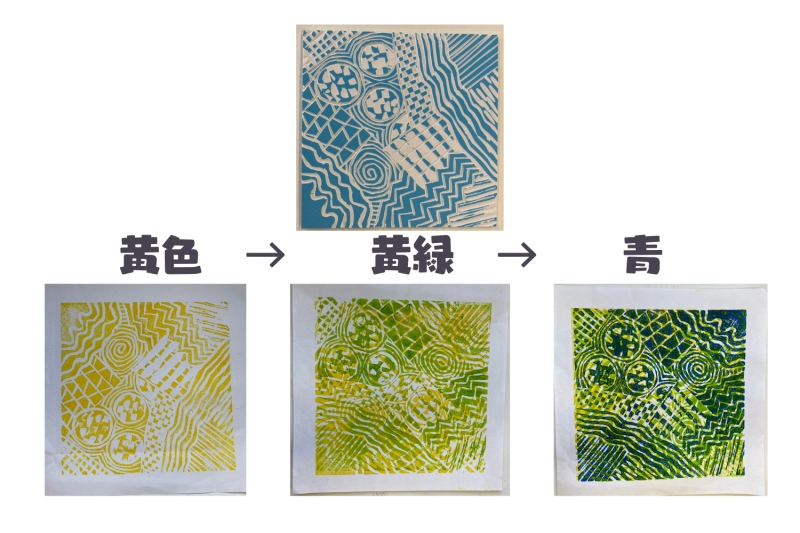 複数の色を使って刷り重ねることで、色の混じり合いも楽しめます♪