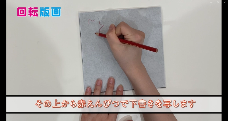 版画板の上にカーボン紙、トレーシングペーパーをのせて、上から赤鉛筆で下書きをなぞって板にうつしていきます!