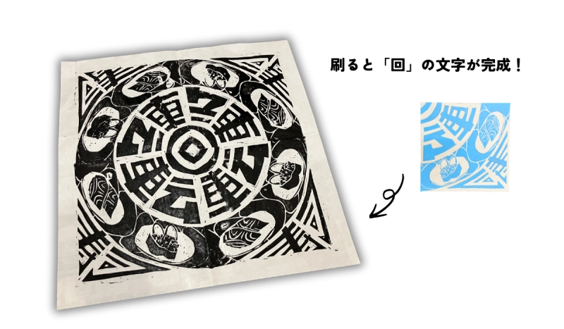 「回」を、版の角につながるように彫ると、回して彫ったときに 「回」の漢字が浮かび上がりました!!!!