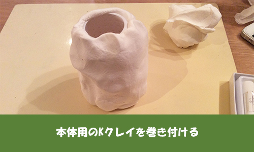 本体用のKクレイを適当な大きさに伸ばし、土台のペン立てに巻き付けます。 初めは上から下まで覆えていればざっくりで構いません。