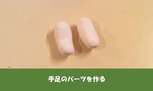 まずは横長の俵型をつくります。 このとき、手首・足首に当たる部分を軽くつまんであげると手足に動きが出ます! 少し長めにつくって、胴体に仮付けしてみながら長さを調整します。 短くするときは、ちぎると形が歪むのでハサミを使って切るのがおすすめです。 このとき、切断面を胴体に貼りつけるための接着面にすると余計な跡が隠せます。 斜めに切ると接着面も増え、接着した時に自然な見た目になります。
