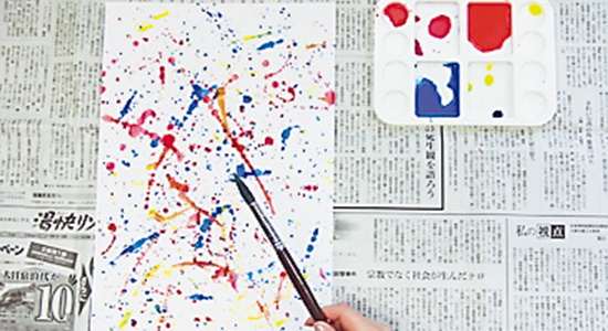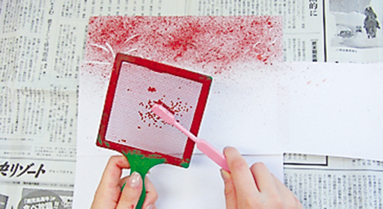 ぼかし網を台紙から10cmほど離し、上から濃いめの絵の具をつけたブラシでこする。