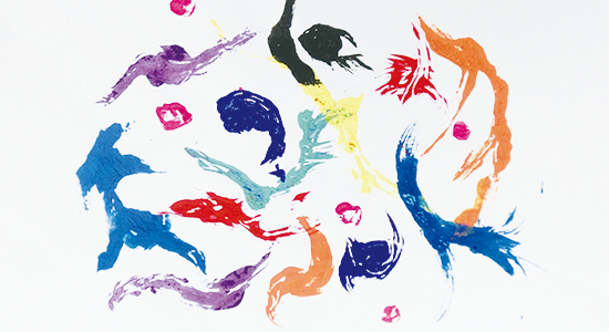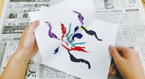 ガラスや吸水性の低い紙などの上に絵の具を出し、上から用紙をあててこすり、写し取る。