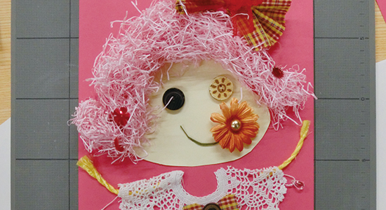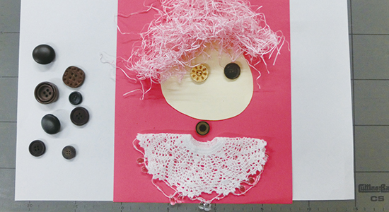 紙や写真、布などをはりつけて図柄を作る。