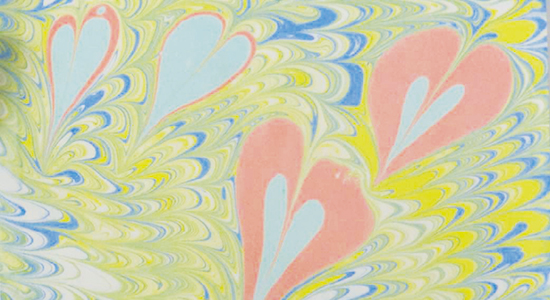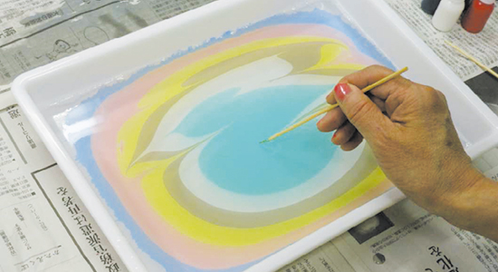 水面に墨汁や油で溶いた油性絵の具をたらし、できた模様を上から紙をあて、写し取る。